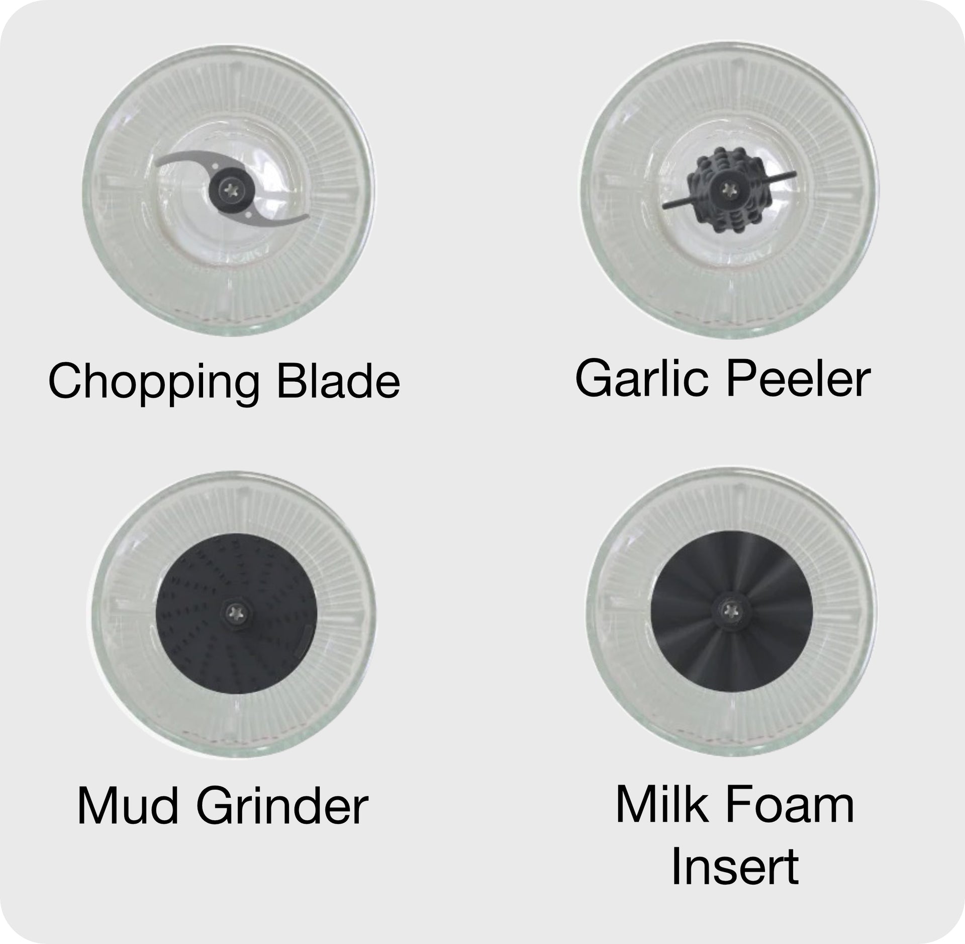 | scope of delivery | CHOPIT Motor unit User manual Lid Mixing cup Glass Chopping blade ABS/ Stainless steel adapter rod ABS Mud Grinder Insert ABS Milk Foam Insert ABS Garlic Peeler Silikon USB-C charging cable* |